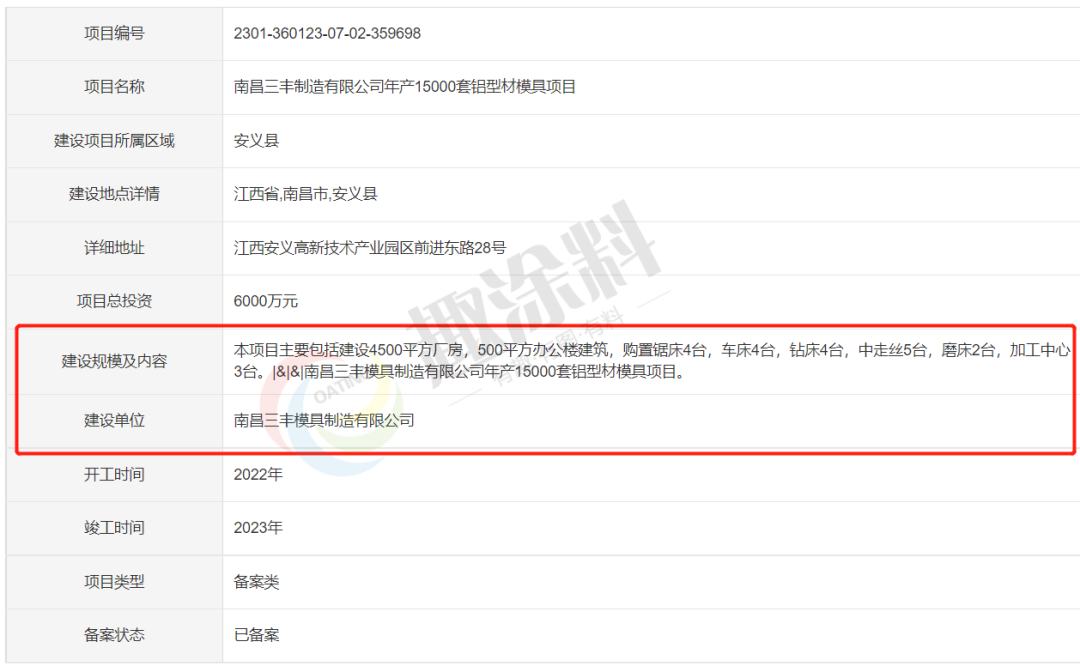 2023年1月18日,南昌三豐模具制造有限公司,年產(chǎn)15000套鋁型材模具項(xiàng)目,進(jìn)行企業(yè)項(xiàng)目備案。