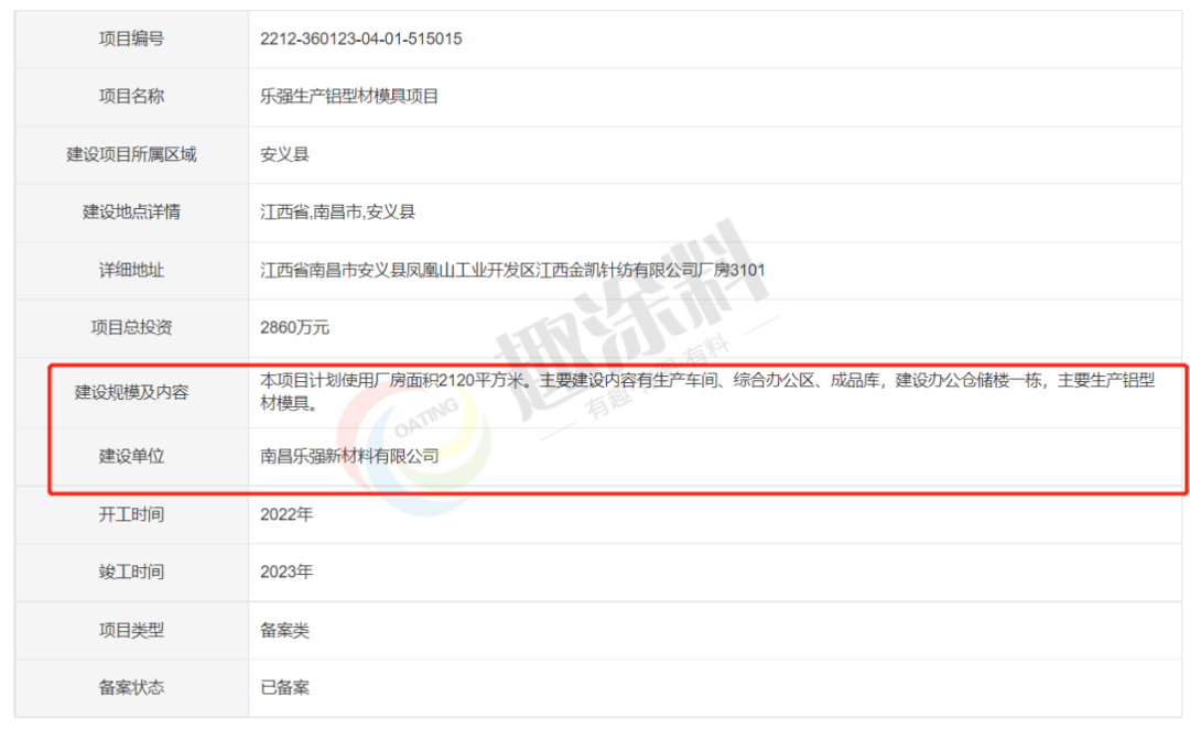 2023年1月11日,南昌樂(lè)強(qiáng)新材料有限公司,生產(chǎn)鋁型材模具項(xiàng)目,進(jìn)行企業(yè)項(xiàng)目備案。