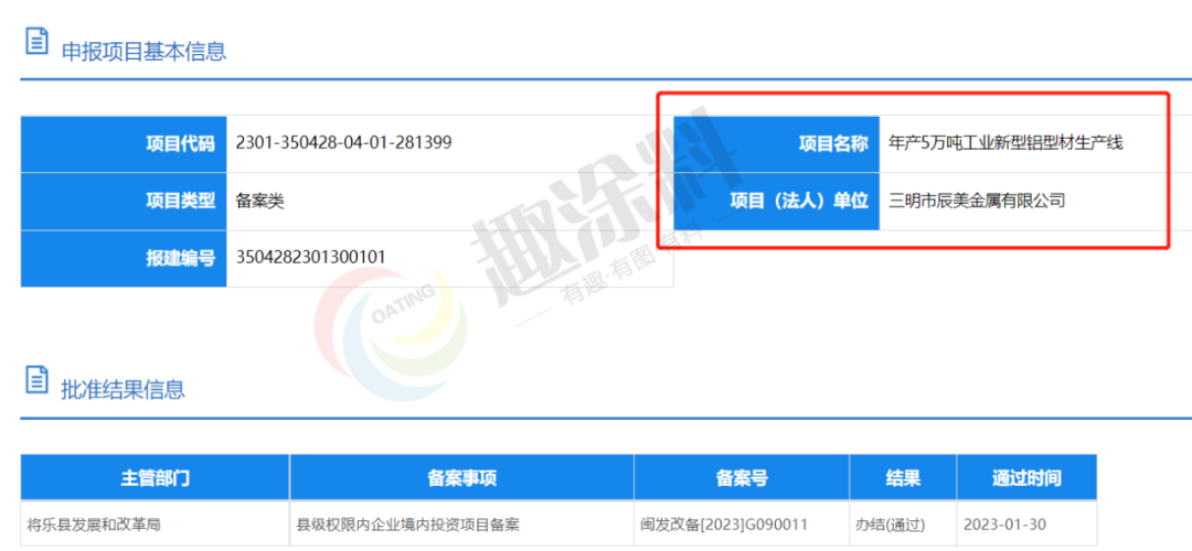 2023年1月30日,三明市辰美金屬有限公司,年產(chǎn)5萬(wàn)噸工業(yè)新型鋁型材生產(chǎn)線(xiàn),在將樂(lè)縣發(fā)展和改革局,進(jìn)行縣級(jí)權(quán)限內(nèi)企業(yè)境內(nèi)投資項(xiàng)目備案。