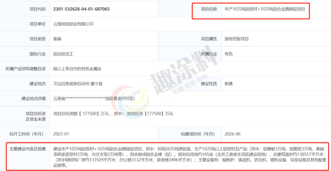 2023年1月11日,云南桂鋁鋁業(yè)有限公司,年產(chǎn)10萬(wàn)噸鋁型材+10萬(wàn)噸鋁合金圓鑄錠項(xiàng)目,在富寧縣發(fā)展和改革局,進(jìn)行企業(yè)投資項(xiàng)目備案。