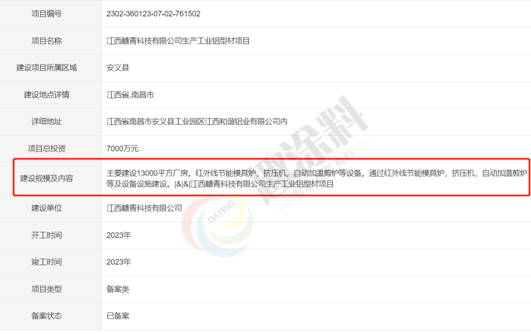 2023年2月23日,江西佰鋁鋁業(yè)有限公司,擴(kuò)建鋁型材生產(chǎn)線項(xiàng)目,進(jìn)行企業(yè)項(xiàng)目備案。