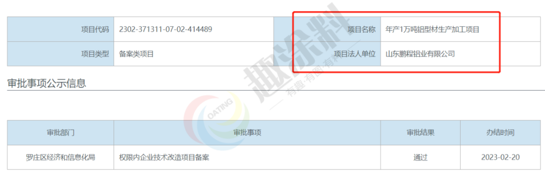 2023年2月20日,山東鵬程鋁業(yè)有限公司,年產(chǎn)1萬(wàn)噸鋁型材生產(chǎn)加工項(xiàng)目,在羅莊區(qū)經(jīng)濟(jì)和信息化局,進(jìn)行權(quán)限內(nèi)企業(yè)技術(shù)改造項(xiàng)目備案。