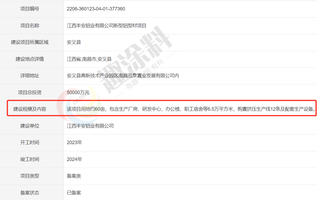2023年2月8日,江西豐安鋁業(yè)有限公司,新型鋁型材項(xiàng)目,進(jìn)行企業(yè)項(xiàng)目備案。