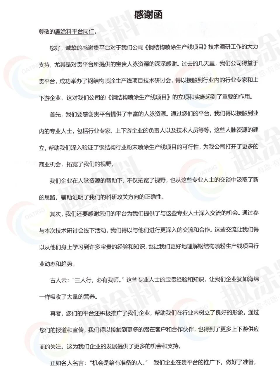 調(diào)研結(jié)束后,科鑫重工給趣涂料平臺(tái)發(fā)來的《感謝函》介紹,科鑫重工通過本次研討會(huì)收獲頗豐,達(dá)到了預(yù)期目標(biāo)。通過《感謝函》可以了解到,科鑫重工不僅拓寬了視野、汲取了新的思路、輔助證明了其項(xiàng)目的可行性,更學(xué)習(xí)到許多寶貴的經(jīng)驗(yàn)和知識(shí),也使其更好地理解鋼結(jié)構(gòu)噴粉生產(chǎn)線項(xiàng)目行業(yè)動(dòng)態(tài)和趨勢(shì)。