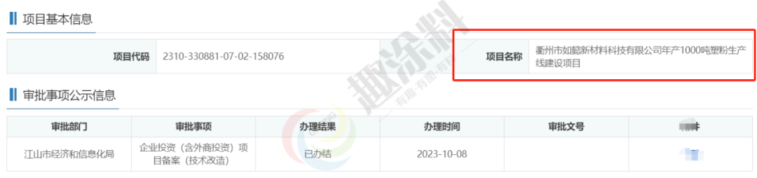 2023年10月8日,衢州市如懿新材料科技有限公司,年產(chǎn)1000噸塑粉生產(chǎn)線建設(shè)項目,在江山市經(jīng)濟(jì)和信息化局,進(jìn)行企業(yè)投資(含外商投資)項目備案(技術(shù)改造)。