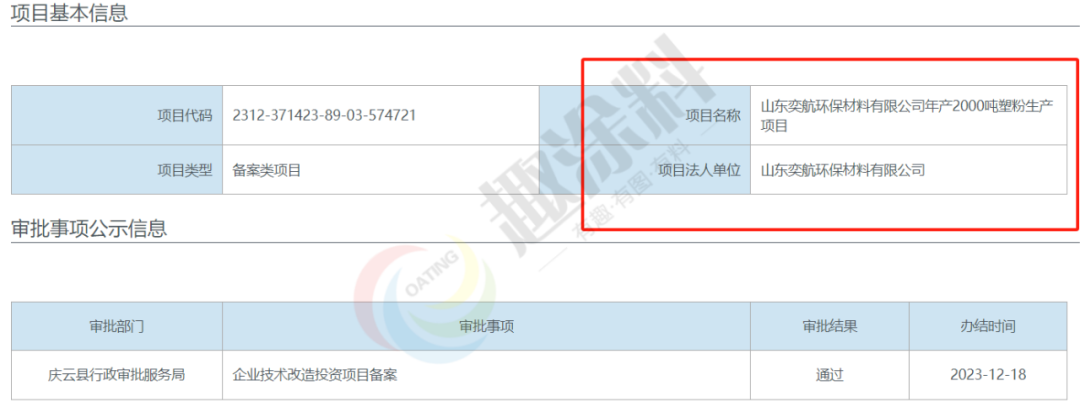 2023年12月8日,山東奕航環(huán)保材料有限公司,年產(chǎn)2000噸塑粉生產(chǎn)項目,在慶云縣行政審批服務(wù)局,進(jìn)行企業(yè)技術(shù)改造投資項目備案。