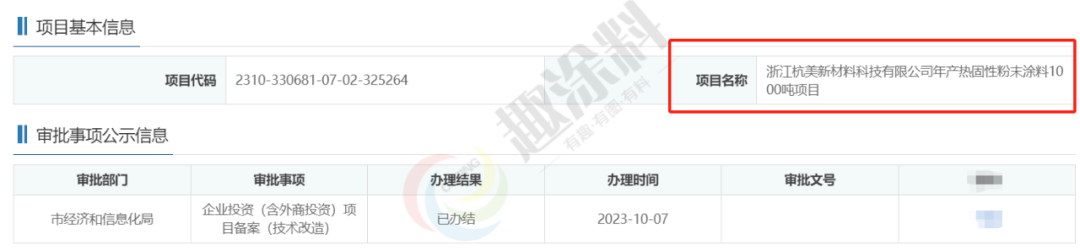 2023年10月7日,浙江杭美新材料科技有限公司,年產(chǎn)熱固性粉末涂料1000噸項目,在市經(jīng)濟(jì)和信息化局,進(jìn)行企業(yè)投資(含外商投資)項目備案(技術(shù)改造)。