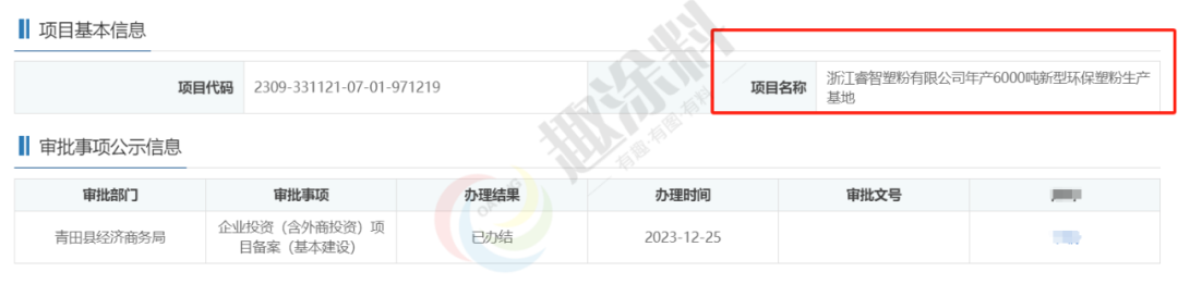 2023年12月25日,浙江睿智塑粉有限公司,年產(chǎn)6000噸新型環(huán)保塑粉生產(chǎn)基地,在青田縣經(jīng)濟(jì)商務(wù)局,進(jìn)行企業(yè)投資(含外商投資)項目備案。