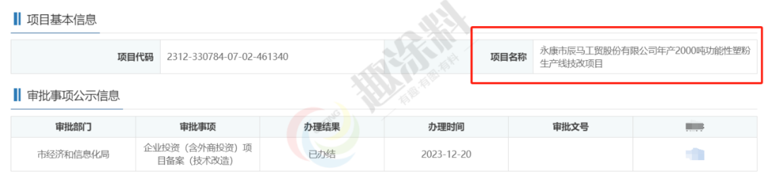 2023年12月20日,永康市辰馬工貿(mào)股份有限公司,年產(chǎn)2000噸功能性塑粉生產(chǎn)線技改項目,在市經(jīng)濟(jì)和信息化局,進(jìn)行企業(yè)投資(含外商投資)項目備案。