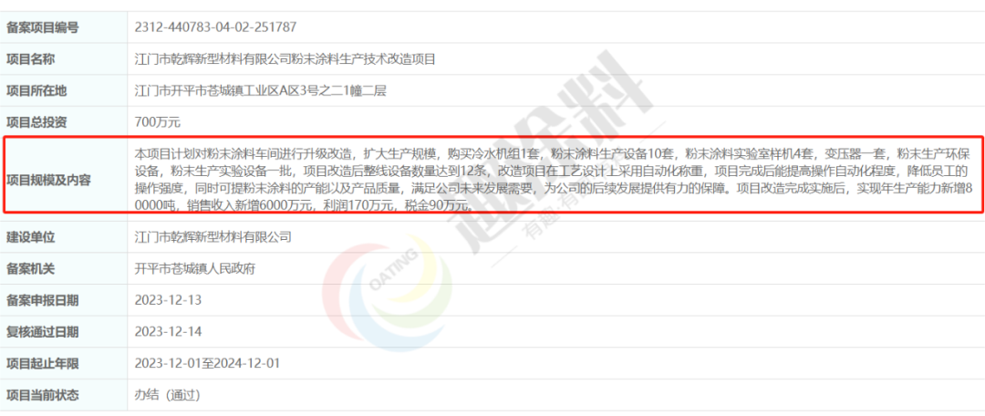 2023年12月14日,江門市乾輝新型材料有限公司,粉末涂料生產(chǎn)技術(shù)改造項目,在開平市蒼城鎮(zhèn)人民政府,進(jìn)行企業(yè)投資項目備案。
