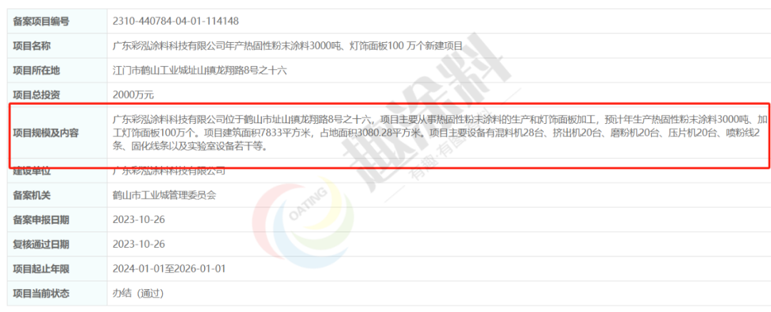 2023年10月26日,廣東彩泓涂料科技有限公司,年產(chǎn)熱固性粉末涂料3000噸、燈飾面板100 萬個新建項目,在鶴山市工業(yè)城管理委員會,進(jìn)行企業(yè)投資項目備案。
