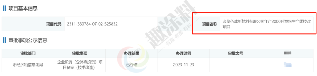 2023年11月23日,金華佰成新材料有限公司,年產(chǎn)2000噸塑粉生產(chǎn)線技改項目,在市經(jīng)濟(jì)和信息化局,進(jìn)行企業(yè)投資(含外商投資)項目備案(技術(shù)改造)。
