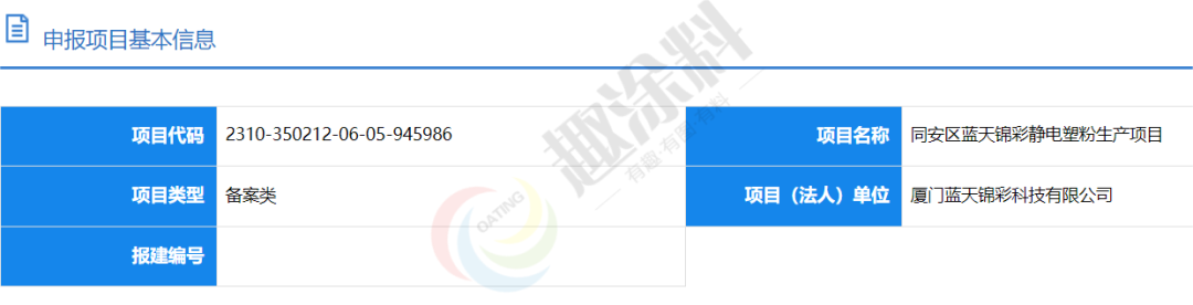 2023年10月9日,廈門藍(lán)天錦彩科技有限公司,靜電塑粉生產(chǎn)項目,在廈門市同安區(qū)發(fā)展和改革局,進(jìn)行縣級權(quán)限內(nèi)企業(yè)境內(nèi)投資項目備案。