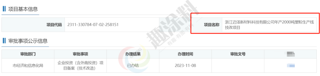 2023年11月8日,浙江邁澤新材料科技有限公司,年產(chǎn)2000噸塑粉生產(chǎn)線技改項目,在市經(jīng)濟(jì)和信息化局,進(jìn)行企業(yè)投資(含外商投資)項目備案(技術(shù)改造)。