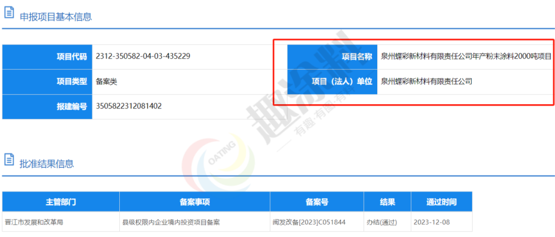 2023年12月8日,泉州蝶彩新材料有限責(zé)任公司,年產(chǎn)粉末涂料2000噸項目,在晉江市發(fā)展和改革局,進(jìn)行縣級權(quán)限內(nèi)企業(yè)境內(nèi)投資項目備案。