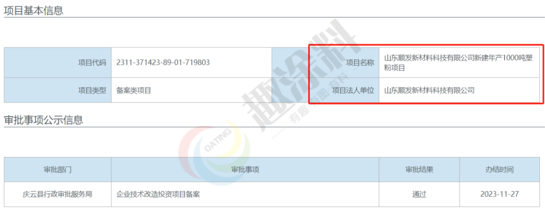 2023年11月27日,山東順發(fā)新材料科技有限公司,新建年產(chǎn)1000噸塑粉項目,在慶云縣行政審批服務(wù)局,進(jìn)行企業(yè)技術(shù)改造投資項目備案。