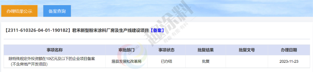2023年11月23日,君禾粉末,新型粉末涂料廠房及生產(chǎn)線建設(shè)項目,在眉縣發(fā)展和改革局,進(jìn)行企業(yè)項目備案。