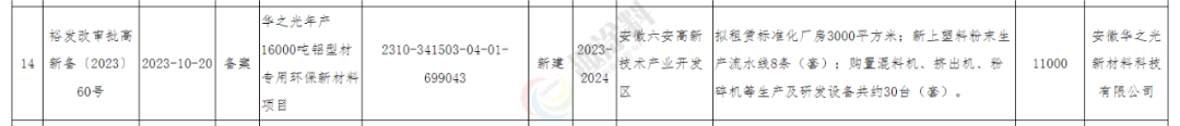 2023年10月20日,安徽華之光新材料科技有限公司,年產(chǎn)16000噸無溶劑新型高性能功能粉末涂料項目,在裕安區(qū)發(fā)展改革委,進(jìn)行企業(yè)投資項目備案。