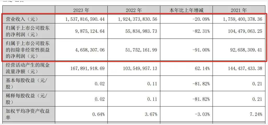 根據(jù)年報披露,2023年,正丹股份實現(xiàn)營業(yè)收入15.38億元,同比下降20.09%;實現(xiàn)凈利潤987.51萬元,同比下滑82.31%;實現(xiàn)扣非后凈利潤465.83萬元,同比下滑91%。