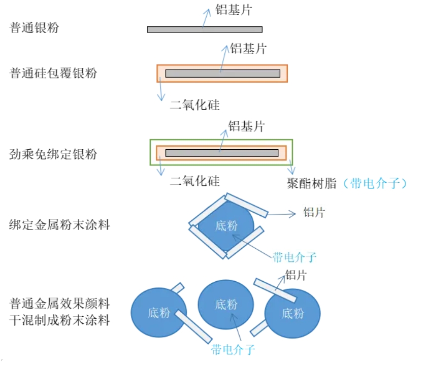 在硅包覆的鋁片基礎(chǔ)上再包覆聚酯樹脂,這與我們粉末涂料的透明底粉類似,這個(gè)聚酯樹脂有非常好的穩(wěn)定的帶電性,聚槍風(fēng)險(xiǎn)低,即使添加量較大也不聚槍,同時(shí)顏色很均勻。可以不用綁定,直接干混使用。因?yàn)榻饘俜郾砻嬗幸粚泳埘渲?,?dāng)金屬粉噴到被施工物件后,高溫熔融成膜的時(shí)候,金屬顏料表面包覆的聚酯樹脂會(huì)參與成膜,將銀粉牢牢的固定在漆膜中,銀粉表面成膜的樹脂也給漆膜帶來超流平和優(yōu)異的高光澤,從而避免了掉銀、手印等現(xiàn)象。銀粉表面樹脂成膜的機(jī)理本質(zhì)上和油漆的罩光是一個(gè)道理。油漆的金屬漆施工后,往往會(huì)再噴一道透明的清漆,這就是罩光過程,從而保護(hù)金屬漆層不被腐蝕破壞等,這個(gè)可以參考汽車漆施工。