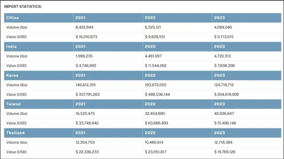 據(jù)美方統(tǒng)計,2023年美國自各涉案國家和地區(qū)進(jìn)口被調(diào)查產(chǎn)品的金額分別約為:中國大陸571萬美元、印度764萬美元、韓國2億美元、臺灣地區(qū)5150萬美元、泰國1977萬美元;估計傾銷幅度為:中國:264.87~351.97%、印度:11.43~17.50%、韓國:30.01~69.42%、臺灣:87.19~136.02%、泰國:163.94~205.63%。