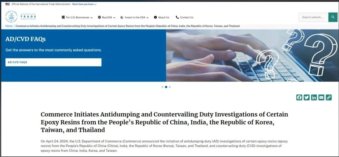 美國商務(wù)部正式對原產(chǎn)于中國的環(huán)氧樹脂發(fā)起雙反調(diào)查