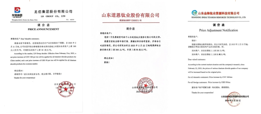 此外,鈦白粉的價格也呈現上漲態(tài)勢。近期,龍柏集團再次領漲,惠云鈦業(yè)、海峰鑫、山東東佳等十幾家鈦白粉企業(yè)在一周之內集體發(fā)函宣布漲價,掀起了年內第二波集體漲價潮。國內鈦白粉價格普遍上漲300元/噸,海外價格普遍上漲50美元/噸。而在春節(jié)前夕的一月下旬,鈦白粉行業(yè)也曾進行過集體價格調整。兩次累計來看,國內鈦白粉銷售價格最高上漲了1100元/噸,海外價格最高調漲了150美元/噸。