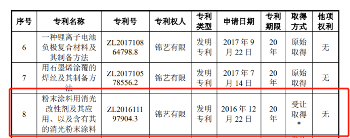 趣涂料(趣涂網)注意到,錦藝新材近年不斷加強在粉末涂料方面的研發(fā)投入,公司現擁有“一種粉末涂料用耐沖擊復合材料及改性粉末涂料”和“粉末涂料用消光改性劑及其應用化、以及含有其的消光粉末涂料”兩項發(fā)明專利。