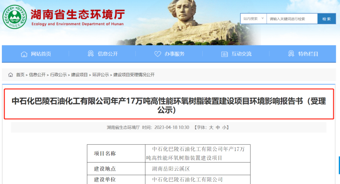 2023年4月18日,湖南省生態(tài)環(huán)境廳受理中石化巴陵石油化工有限公司年產(chǎn)17萬(wàn)噸高性能環(huán)氧樹(shù)脂裝置建設(shè)項(xiàng)目環(huán)境影響報(bào)告書(shū)。