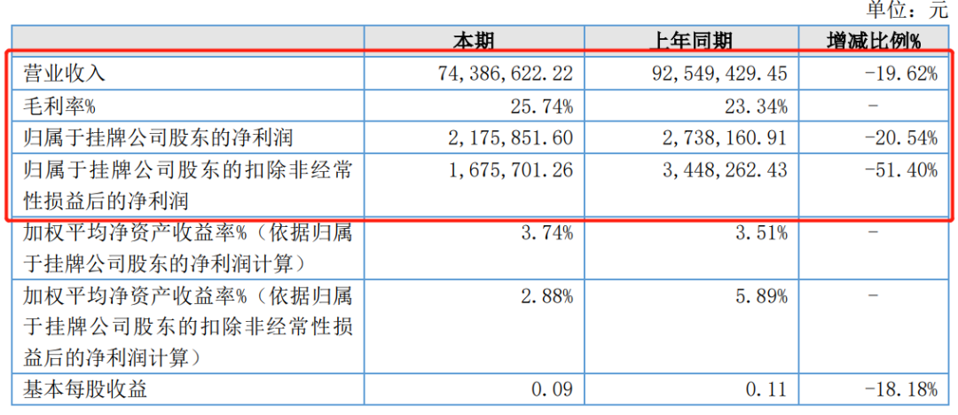 年報顯示,科網(wǎng)股份2022年實現(xiàn)營業(yè)收入7438.66萬元,同比上一年9254.94萬元,下滑19.62%;實現(xiàn)歸屬于掛牌公司股東的凈利潤217.59萬元,同比上一年273.82萬元,下滑20.54%;實現(xiàn)扣非后凈利潤167.57萬元,同比上一年344.83萬元,下滑51.4%。
