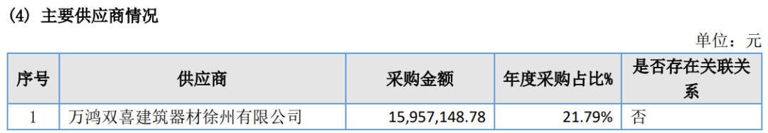 2022年,科網(wǎng)股份的主要供應(yīng)商為萬鴻雙喜建筑器材徐州有限公司采購金額1595.71萬元;上海今寧供應(yīng)鏈有限公司采購金額486.47萬元;安徽美佳新材料股份有限公司采購金額362.41萬元;萬鴻雙喜集團河北有限公司采購金額338.69萬元;蕪湖合晟機械設(shè)備科技有限公司采購金額246.48萬元。