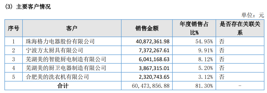 對此,科網(wǎng)股份表示:2022 年公司對前五名客戶銷售收入占同期營業(yè)收入的比例較高,客戶集中度較高;此外,2022年公司向第一大客戶格力電器銷售收入占同期營業(yè)收入比例比較高。這主要是由于公司下游行業(yè)企業(yè)相對比較集中決定的,格力電器、美的集團、海爾等為數(shù)不多的公司占據(jù)絕大多數(shù)市場份額。公司自設(shè)立以來即與格力電器合作,依靠自身競爭優(yōu)勢通過其嚴格的供應(yīng)商評審,雙方已形成良好的合作關(guān)系。