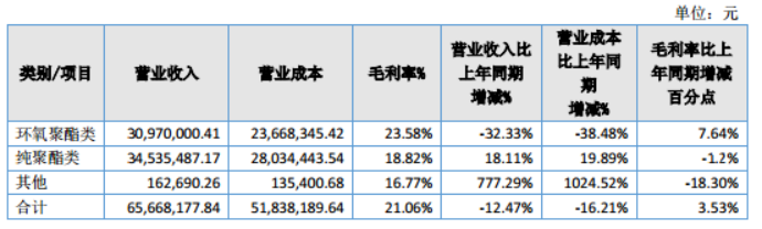 其中環(huán)氧聚酯類實(shí)現(xiàn)營(yíng)業(yè)收入3097萬(wàn)元,同比下滑32.33%;純聚酯類實(shí)現(xiàn)營(yíng)業(yè)收入3453.55萬(wàn)元,同比下滑1.2%。