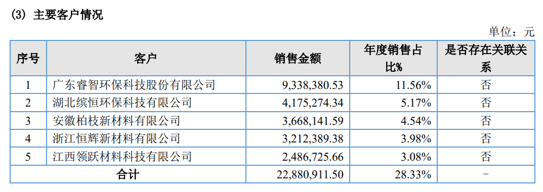 粉末涂裝機(jī)械銷(xiāo)售是公司目前業(yè)務(wù)收入的主要來(lái)源。根據(jù)披露,圣士達(dá)2022年主要客戶(hù)有廣東睿智環(huán)??萍脊煞萦邢薰荆?33.84萬(wàn)元)、湖北繽恒環(huán)??萍加邢薰荆?17.53萬(wàn)元)、安徽柏枝新材料有限公司(366.81萬(wàn)元)、浙江恒輝新材料有限公司(321.24萬(wàn)元)、江西領(lǐng)躍材料科技有限公司(248.67萬(wàn)元)。
