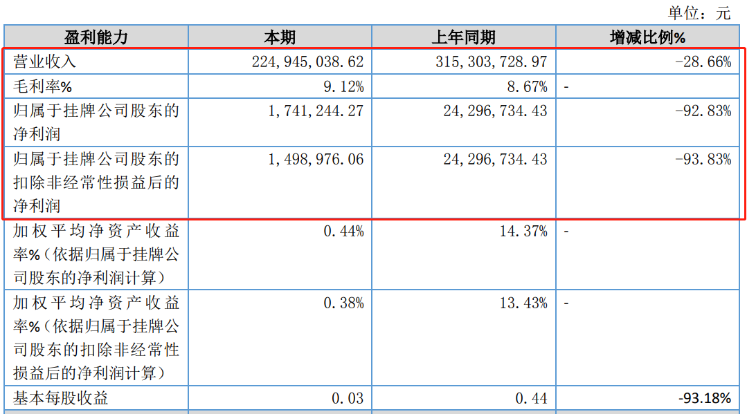 近日,安徽恒泰新材料科技股份有限公司(下稱“恒泰新科”)對外發(fā)布半年報。根據(jù)披露,2023年上半年恒泰新科營業(yè)收入為2.25億元,同比下滑28.66%;實現(xiàn)凈利潤174.12萬元,同比下滑92.83%;實現(xiàn)扣非后凈利潤149.9萬元,同比下滑93.83%。