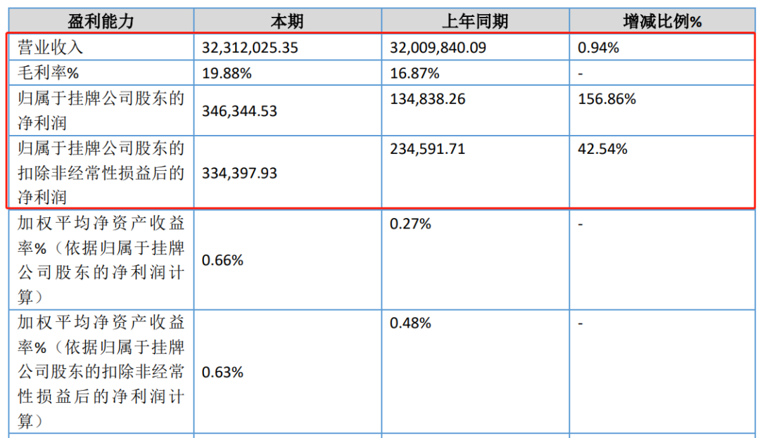 飛揚科技2023年上半年實現(xiàn)營業(yè)收入3231.2萬元,同比增長0.94%;實現(xiàn)凈利潤34.63萬元,同比增長156.86%;實現(xiàn)扣非后凈利潤33.44萬元,同比增長42.54%。