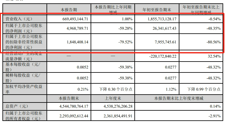 報(bào)告顯示,神劍股份2023年前三季度實(shí)現(xiàn)營(yíng)業(yè)收入18.56億元,同比下滑0.54%;實(shí)現(xiàn)凈利潤(rùn)2634.16萬(wàn)元,同比下滑48.35%;實(shí)現(xiàn)扣非后凈利潤(rùn)795.57萬(wàn)元,同比下滑80.56%%。其中,第三季度實(shí)現(xiàn)營(yíng)業(yè)收入6.69億元,同比增長(zhǎng)1%;實(shí)現(xiàn)凈利潤(rùn)496.88萬(wàn)元,同比下滑59.28%;實(shí)現(xiàn)扣非后凈利潤(rùn)184.84萬(wàn)元,同比下滑79.52%。