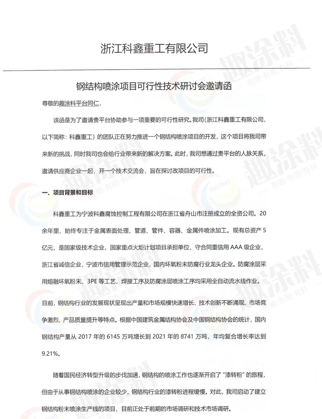 9月15日,一封充滿挑戰(zhàn)的“邀請(qǐng)函”傳到了趣涂料平臺(tái),該邀請(qǐng)函的發(fā)送人正是科鑫重工。了解到科鑫重工希望通過(guò)趣涂料(趣涂網(wǎng))平臺(tái)的專業(yè)人脈關(guān)系,邀約行業(yè)內(nèi)的專業(yè)人士,包括噴涂專家、上下游企業(yè)負(fù)責(zé)人和技術(shù)人員,助其召開(kāi)一個(gè)“海洋鋼結(jié)構(gòu)噴粉生產(chǎn)線項(xiàng)目”的可行性技術(shù)研討會(huì)。之所以是充滿挑戰(zhàn),主要是目前行業(yè)鋼結(jié)構(gòu)轉(zhuǎn)粉案例不多,更何況是海洋高防腐、高耐候。盡管如此,科鑫重工表示:有信心通過(guò)自身研發(fā)升級(jí)及此次調(diào)研打開(kāi)鋼結(jié)構(gòu)環(huán)保噴涂市場(chǎng),引領(lǐng)行業(yè)發(fā)展。
