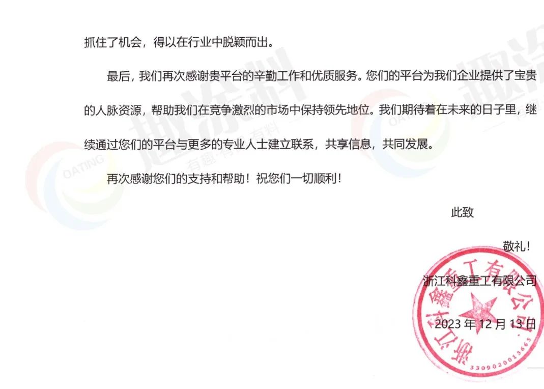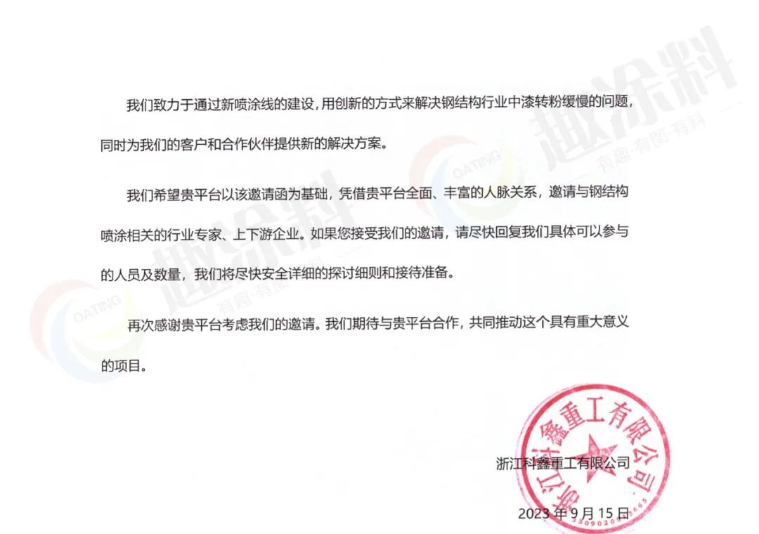 趣涂料(趣涂網(wǎng))平臺(tái)“沉甸甸”的收獲。沉甸甸的,不僅是紙張的重量,更是合作情誼與共同成果的分量。在這封感謝函的背后,不僅是科鑫重工對(duì)趣涂料平臺(tái)深深的感激,更是對(duì)趣涂料(趣涂網(wǎng))平臺(tái)在鋼結(jié)構(gòu)噴粉項(xiàng)目技術(shù)調(diào)研中無(wú)私貢獻(xiàn)的認(rèn)可。