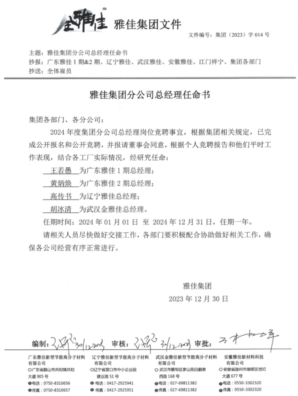 2023年12月29日,雅佳集團2024年度總經(jīng)理崗位競聘大會在集團各工廠線上線下同步舉行,集團董事長王桂祥和各工廠在職正式股東,以及各廠部職工出席會議。舉行總經(jīng)理崗位競聘大會,是“為雅佳選將才,為人才搭平臺”。雅佳希望通過競聘會,讓優(yōu)秀者脫穎而出,讓所有人長知識、開眼界,讓公司踏上新征程。