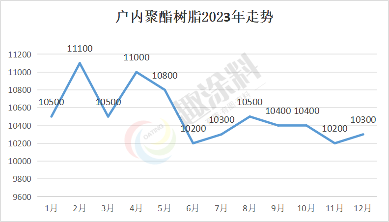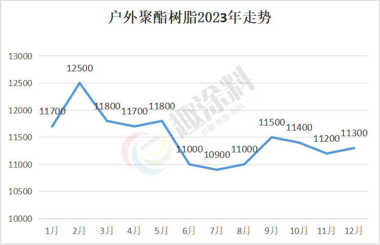 2023年,戶內(nèi)聚酯最高點(diǎn)在11100元/噸,最低點(diǎn)在10200元/噸;戶外聚酯最高點(diǎn)在12500元/噸,最低點(diǎn)在10900元/噸。二者全年整體均呈現(xiàn)緩慢下滑趨勢(shì)。
