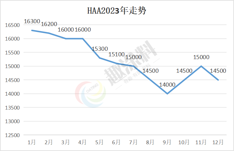 縱觀全年來看,2023年HAA最高點(diǎn)比上一年最低點(diǎn)還要低,全年最高點(diǎn)僅在年初的16300元/噸上下,最低點(diǎn)在14000元/噸,年末出現(xiàn)小幅反彈,以14500元/噸收官。