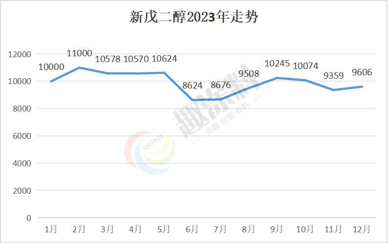 和2022年高低點(diǎn)相差8950元/噸的劇烈波動(dòng)相比,2023年新戊二醇價(jià)格走勢(shì)平穩(wěn)的出奇,屬于近三年的低位運(yùn)行。除了年初因工廠停車、備貨影響價(jià)格上漲外,全年受制于下游需求有限,大部分時(shí)間新戊二醇價(jià)格都在8600~11000元左右區(qū)間整理。