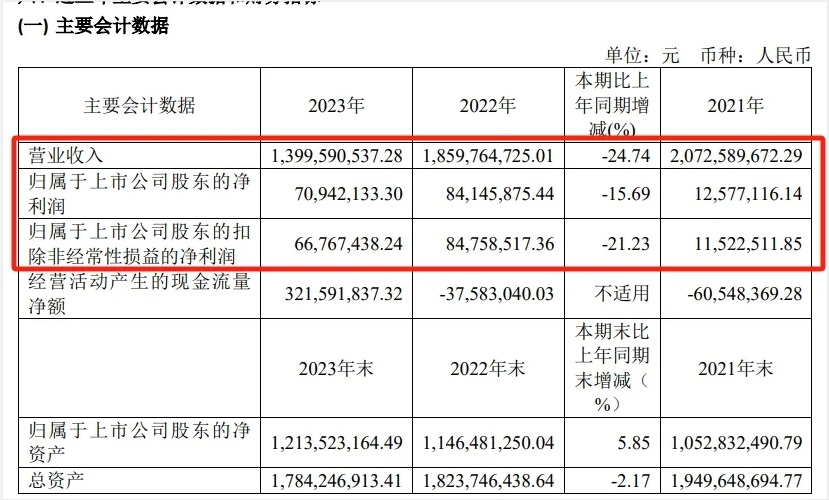 年報中指出,2023年上緯新材實現(xiàn)營業(yè)收入為14億元,較上年同期減少24.74%,實現(xiàn)凈利潤7094.21萬元,較上期減少15.69%,實現(xiàn)扣非后凈利潤6676.74萬元,同比減少21.23%,基本每股收益較上期減少14.29%。