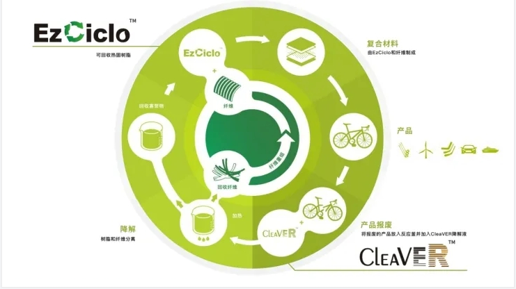上緯全新研發(fā)的EzCiclo可回收熱固環(huán)氧樹脂,可實現(xiàn)在不改變環(huán)境條件下正常應用于葉片的殼體、主梁、腹板等部件。由EzCiclo制成的風電葉片復合材料部件,到了使用年限后可回收降解,經(jīng)過CleaVER技術(shù)將固體廢棄物變?yōu)榛厥绽w維及寡聚物,回收纖維可重整后再利用,再次制成玻璃纖維及碳纖維復合材料,整個降解回收過程簡易、低碳。