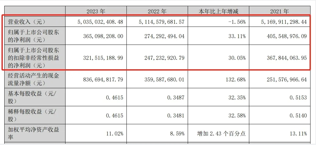 2023年,康力電梯實(shí)現(xiàn)營業(yè)收入達(dá)50.35億元,較上年同期下降1.56%;實(shí)現(xiàn)利潤總額4.09億元,實(shí)現(xiàn)歸屬于上市公司股東的凈利潤3.65億元,與上年同期相比增長了33.11%(公司實(shí)施第二次員工持股計(jì)劃和股票期權(quán)激勵(lì)計(jì)劃的攤銷成本,影響2023年度稅前利潤總額339.93萬元);經(jīng)營活動(dòng)凈現(xiàn)金流量8.3億元。公司經(jīng)營質(zhì)量保持在較高水平。