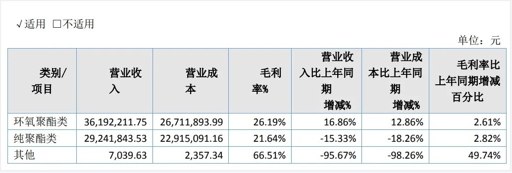 具體產(chǎn)品來看,2023年飛揚科技在環(huán)氧聚酯類和純聚酯類產(chǎn)品的營業(yè)表現(xiàn)上呈現(xiàn)出截然不同的趨勢。環(huán)氧聚酯類產(chǎn)品憑借其出色的性能和廣泛的應(yīng)用領(lǐng)域,在市場競爭中表現(xiàn)強勢,為公司帶來了顯著的營收增長。具體而言,環(huán)氧聚酯類產(chǎn)品在今年實現(xiàn)了營業(yè)收入3619.22萬元,同比增長16.86%,這一數(shù)字不僅彰顯了該類產(chǎn)品的市場競爭力,也反映了公司在產(chǎn)品研發(fā)和市場推廣上的努力成果。