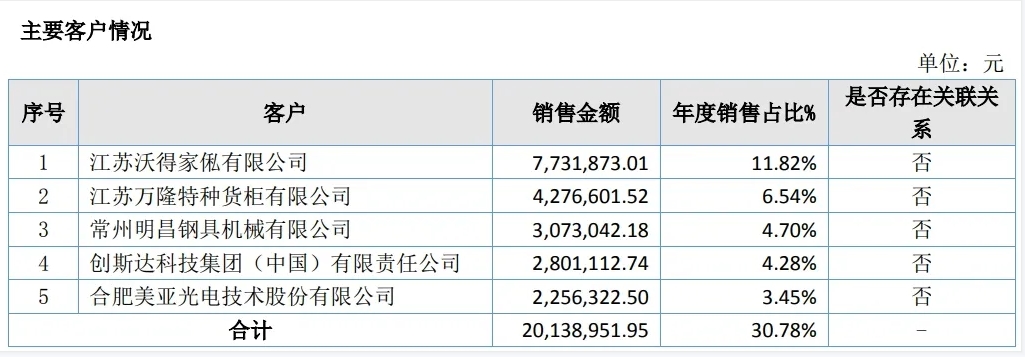 趣涂料(趣涂網(wǎng))注意到,飛揚科技2023年主要客戶為江蘇沃得家俬有限公司(銷售金額773.19萬元)、江蘇萬隆特種貨柜有限公司(銷售金額427.66萬元)、常州明昌鋼具機械有限公司(銷售金額307.3萬元)、創(chuàng)斯達科技集團(中國)有限責任公司(銷售金額280.11萬元)、合肥美亞光電技術(shù)股份有限公司(銷售金額225.63萬元)。