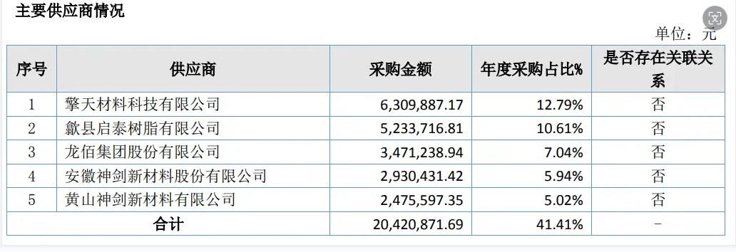 同期,公司主要供應(yīng)商為擎天材料科技有限公司(采購金額630.99萬元)、歙縣啟泰樹脂有限公司(采購金額523.37萬元)、龍佰集團股份有限公司(347.12萬元)、安徽神劍新材料股份有限公司(采購金額293.04萬元)、黃山神劍新材料有限公司(采購金額247.56萬元)。