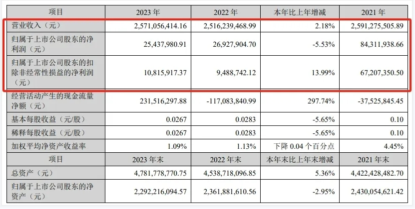 年報(bào)中指出,2023年度,神劍股份實(shí)現(xiàn)營(yíng)業(yè)收入25.71億元,較上年同期增長(zhǎng)2.18%;歸屬于上市公司股東的凈利潤(rùn)2543.80萬元,較上年同期下降5.53%;截至2023年12月31日,公司資產(chǎn)總額47.82億元,歸屬于上市公司股東的凈資產(chǎn)22.92億元,較上年末下降2.95%,資產(chǎn)負(fù)債率51.09%。